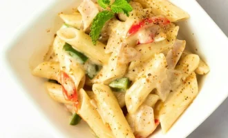 - Do sosu wymieszać czosnek, sos sojowy, musztardę, oliwę z oliwek, natkę pietruszki i wymieszać. Dodać pieczoną paprykę, ponownie wymieszać i posypać serem feta.
