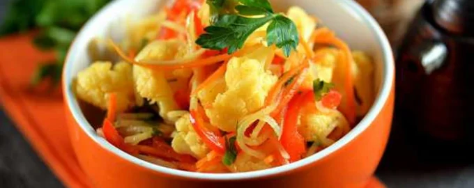 - Rozerwij kalafior na średnie różyczki, posiekaj marchewki, dodaj posiekany czosnek i chili.